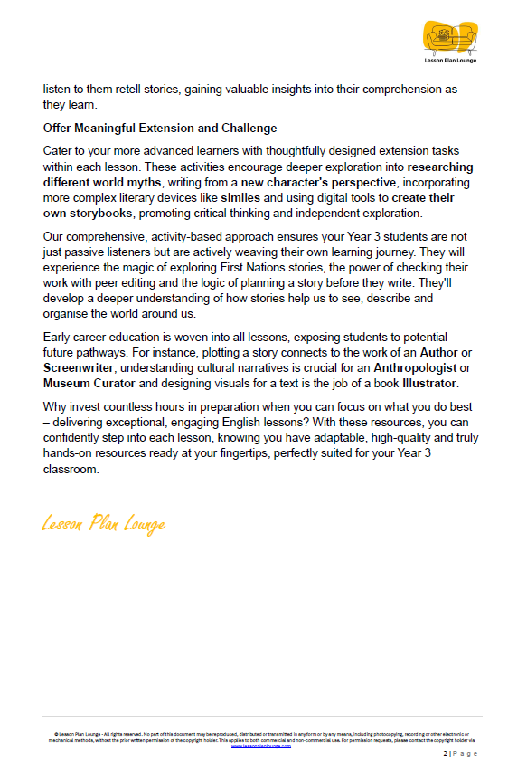 9 Weeks of Engaging Lesson Plans: Guide your students through a journey of discovery, from becoming 'Story Weavers' exploring First Nations myths, climbing a 'Story Mountain' to understand plot, performing a 'Soundscape Creation' to learn about onomatopoeia, and proudly sharing their tales at the final 'Author Celebration!'.
