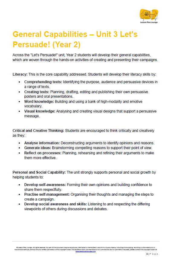 9 Weeks of Engaging Lesson Plans: Guide your students through a journey of advocacy, from becoming "Ad Detectives" to analyse commercials, holding engaging "Class Debates," designing powerful "Persuasive Posters," and delivering a convincing "Pitch to the Principal!" at the final "Great Persuasion Convention."