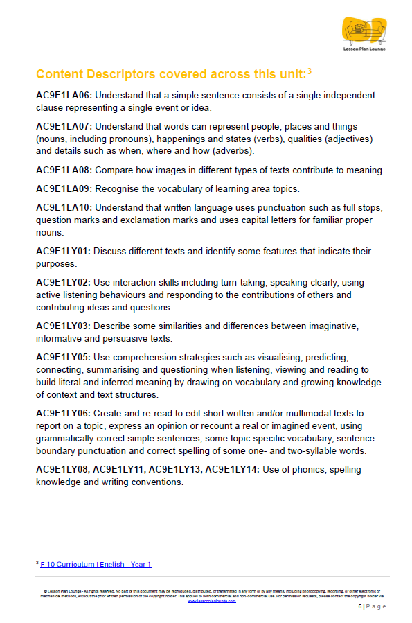 - Australian Curriculum Aligned: This unit is fully aligned with the Year 1 English curriculum. It explicitly covers key content descriptors including AC9E1LA08, AC9E1LA09, AC9E1LY01, AC9E1LY03, and AC9E1LY06.
