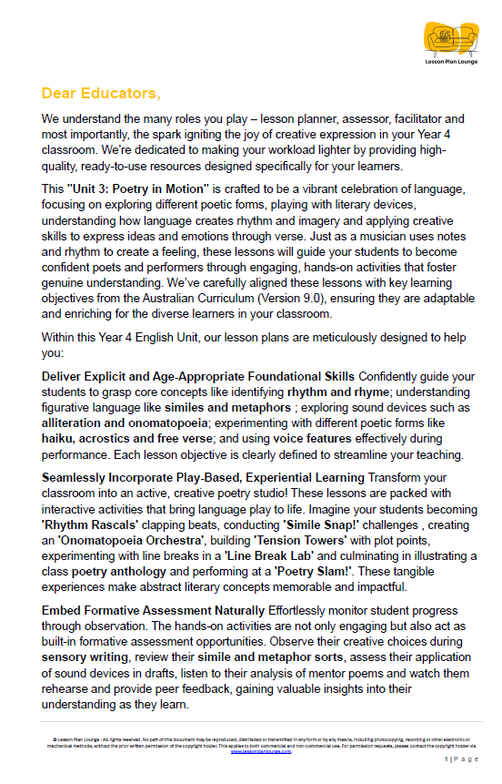 - 9 Weeks of Engaging Lesson Plans: Guide your students through a journey of discovery, from becoming 'Rhythm Rascals' clapping beats, conducting 'Simile Snap!' challenges, creating an 'Onomatopoeia Orchestra', experimenting in a 'Line Break Lab' and culminating in illustrating a class poetry anthology and performing at a 'Poetry Slam!'.