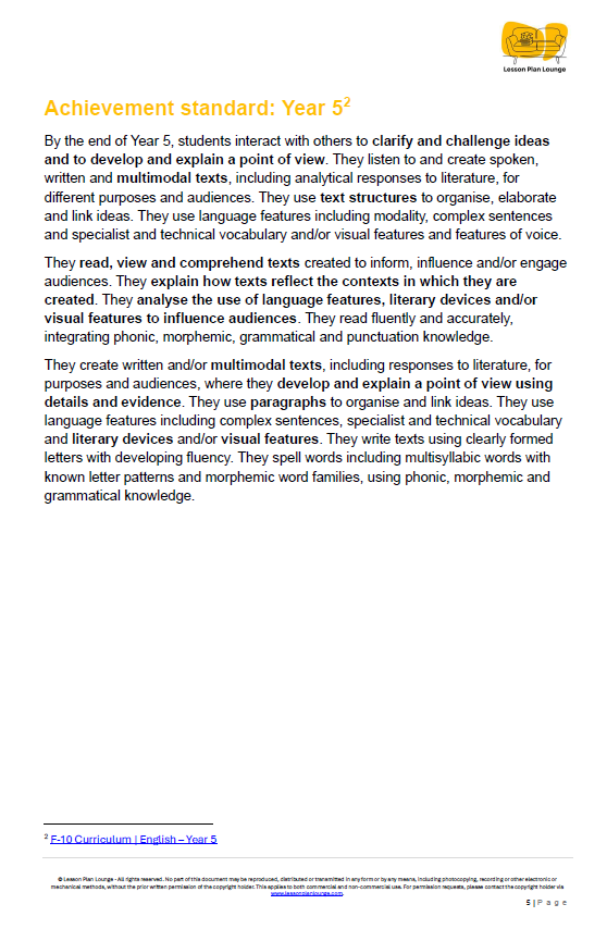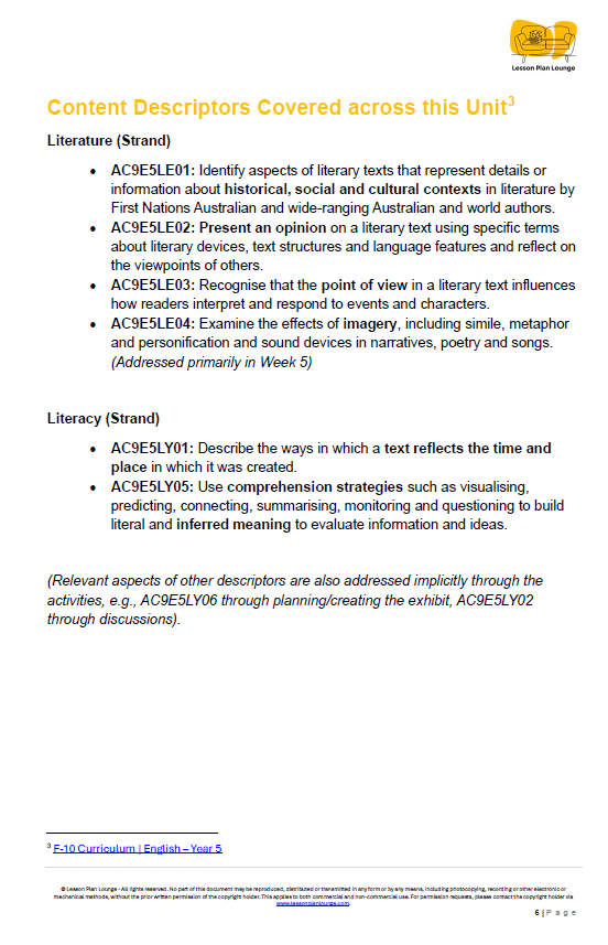 - Australian Curriculum Aligned: This unit is fully aligned with the Year 5 English curriculum. It explicitly covers key content descriptors including AC9E5LE01 (Historical/Social/Cultural Contexts), AC9E5LE02 (Presenting Opinions on Literary Texts), AC9E5LE03 (Point of View), AC9E5LY01 (Text Reflects Time/Place) and AC9E5LY05 (Comprehension Strategies). It also implicitly addresses AC9E5LE04 (Imagery Effects).