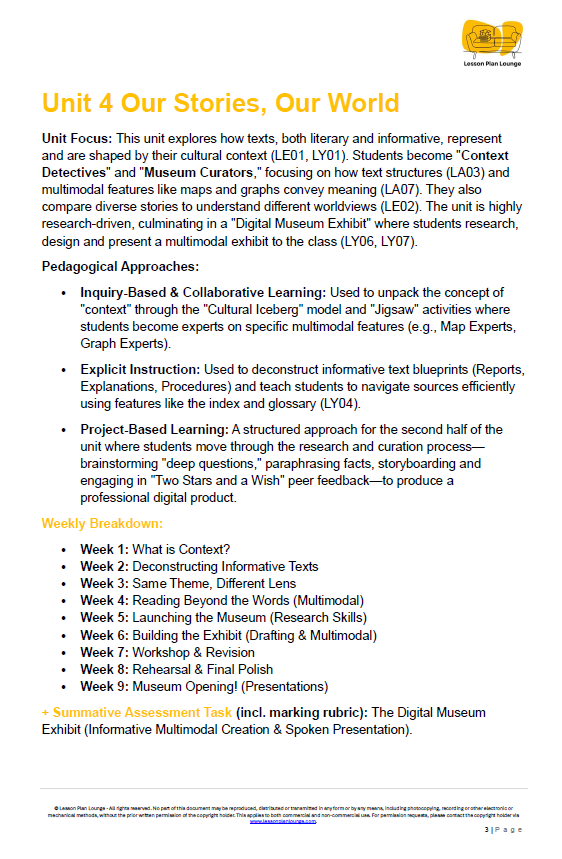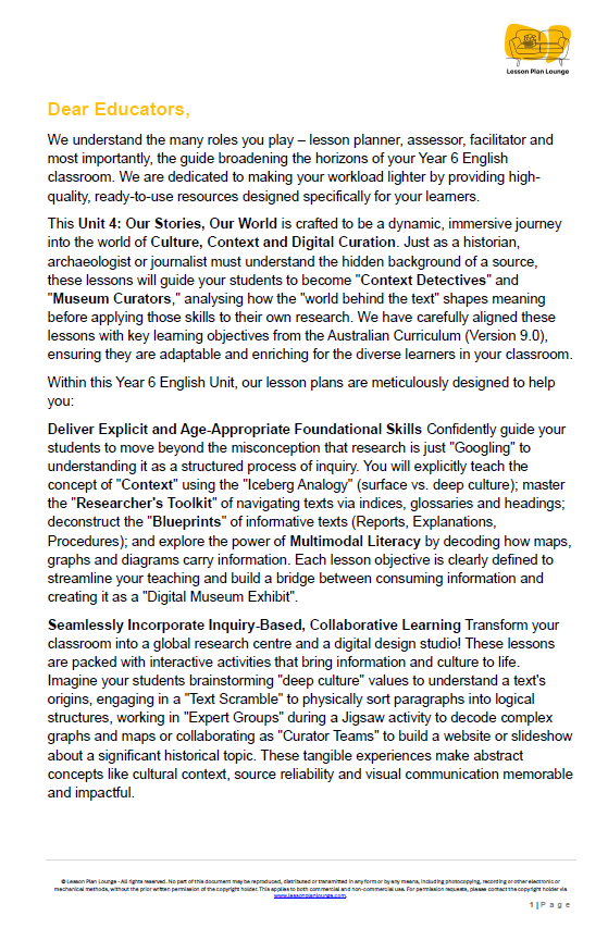 Step into the world of "Unit 4: Our Stories, Our World," a comprehensive English unit designed to save you time and deeply engage your Year 6 students. This unit focuses on building a strong foundation in cultural literacy and information fluency: understanding the "deep context" behind texts, mastering informative structures, interpreting multimodal data, and curating professional digital exhibits.