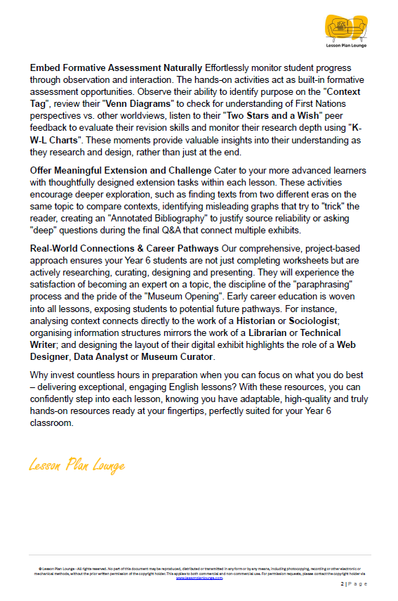 - Built-in Assessment & Differentiation: Effortlessly monitor student progress through natural observation opportunities embedded in each activity, such as 'Context Tags', 'K-W-L Charts', and 'Exit Tickets'. Every lesson includes clear support (e.g., scaffolded sentence starters) and extension tasks (e.g., annotated bibliographies) to cater to all learners.