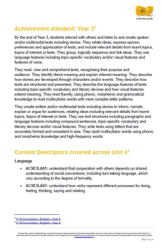 - Australian Curriculum Aligned: This unit is fully aligned with the Year 3 English curriculum. It explicitly covers key content descriptors including AC9E3LE04, AC9E3LE05, AC9E3LA01, AC9E3LY07 and AC9E3LY12.