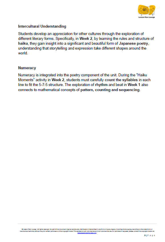 - 9 Weeks of Engaging Lesson Plans: Guide your students through a journey of discovery, from creating a 'Rhythm Orchestra' to feel the beat of poetry, becoming 'Simile Self-Portrait' artists, adapting stories as 'Collaborative Playwrights' and taking a bow at the final 'Showtime!' performance.