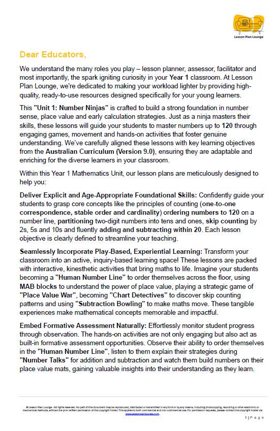 Transform your classroom into an active, ninja-training dojo with our "Unit 1: Number Ninjas" for Year 1! This is the first of four comprehensive units that together cover all mandatory content descriptors for the Year 1 Australian Mathematics Curriculum (Version 9.0).