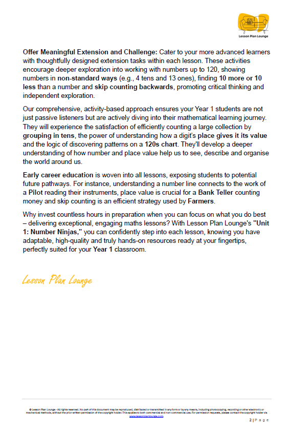 We understand the heavy workload of educators, which is why we've designed this complete 10-week unit to be high-quality, engaging, and ready to use. Say goodbye to countless hours of preparation and confidently guide your students to build a strong foundation in number sense, place value, and early calculation strategies.