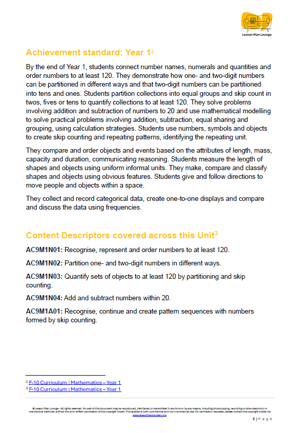 Year 1 Maths Unit Plan: Number Ninjas (Unit 1)