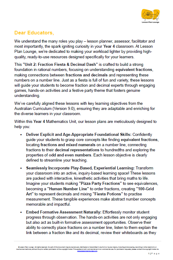 Step into the world of "Unit 2: Fraction Fiesta & Decimal Dash," a comprehensive Mathematics unit designed to save you time and deeply engage your Year 4 students. This unit focuses on building a strong foundation in rational numbers, moving beyond basic recognition to explore equivalent fractions, number lines and the deep connection between fractions and decimals with creativity and flair.