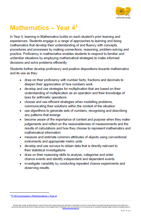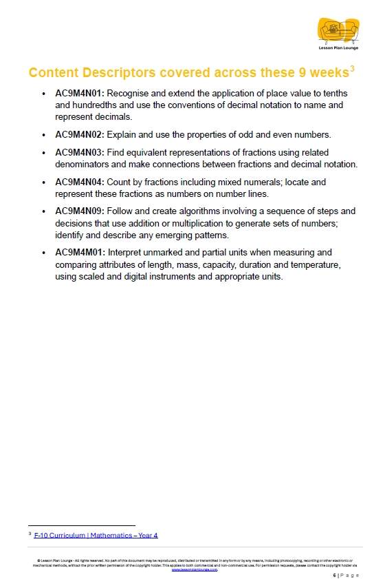 - Australian Curriculum Aligned: This unit is fully aligned with the Year 4 Mathematics curriculum (Version 9.0). It explicitly covers key content descriptors including AC9M4N01, AC9M4N02, AC9M4N03, AC9M4N04, AC9M4N09 and AC9M4M01.