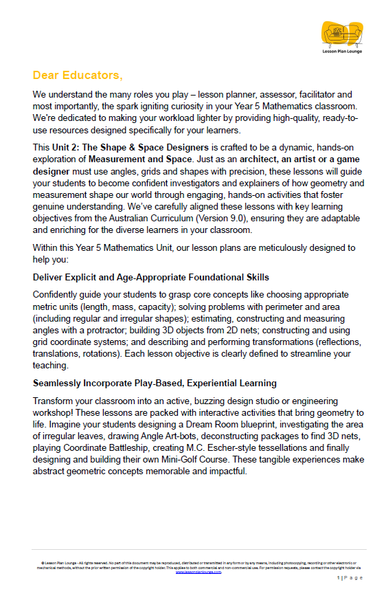 Step into the world of "Unit 2: The Shape & Space Designers", a comprehensive Mathematics unit designed to save you time and deeply engage your Year 5 students. This unit focuses on building a strong foundation in Measurement and Space, moving beyond basic recognition to explore metric units (length, mass, capacity), perimeter and area (including irregular shapes), angles, 3D nets, coordinate systems and transformations with creativity and precision.