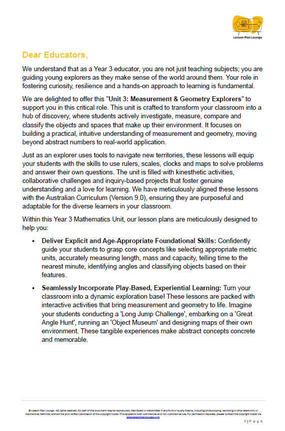Step into the world of "Unit 3: Measurement & Geometry Explorers," a comprehensive Mathematics unit designed to save you time and deeply engage your Year 3 students. This unit focuses on building a strong foundation in measurement and geometry, moving beyond basic recognition to explore length, mass, capacity, time, angles and maps with creativity and precision.