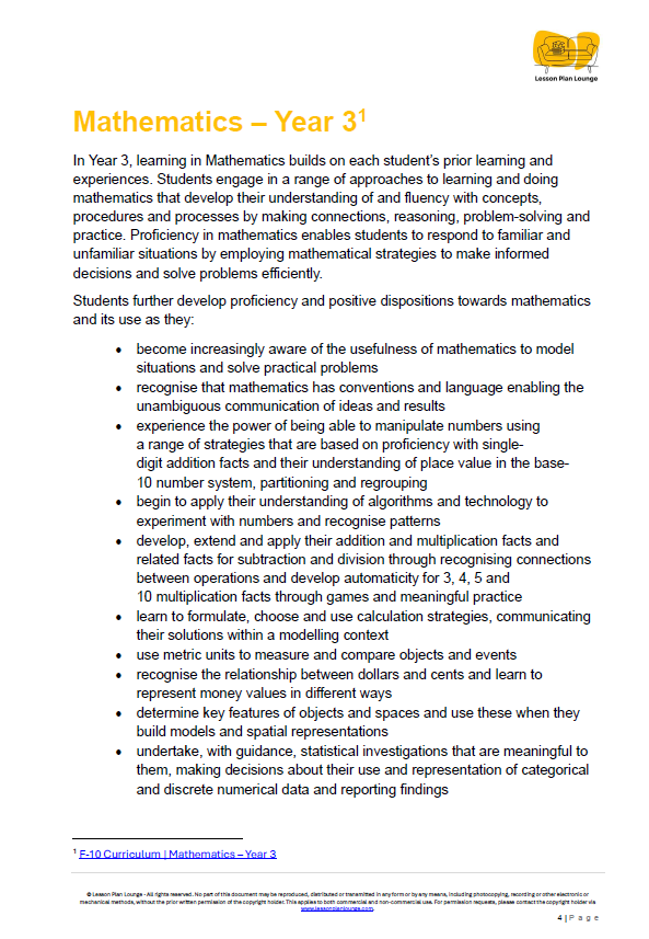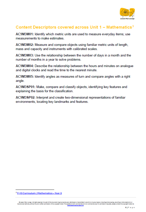 - Australian Curriculum Aligned: This unit is fully aligned with the Year 3 Mathematics curriculum (Version 9.0). It explicitly covers key content descriptors including AC9M3M01, AC9M3M02, AC9M3M03, AC9M3M04, AC9M3M05, AC9M3SP01 and AC9M3SP02.