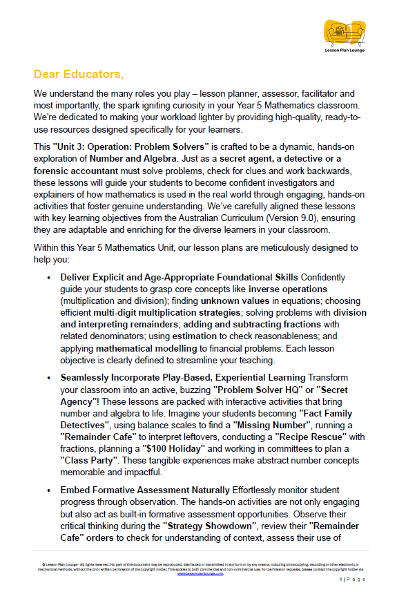 - 9 Weeks of Engaging Lesson Plans: Guide your students through a journey of discovery, from joining "The Inverse Agency", solving "The Case of the Missing Number", running "The Remainder Cafe", conducting a "Recipe Rescue" (fractions) and planning a "$100 Holiday Challenge", all culminating in a thrilling "Problem Solver Escape Room" .