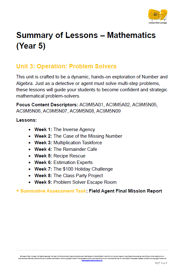 Mathematics - Unit 3: Operation Problem Solvers - LESSON PLANS - Year 5