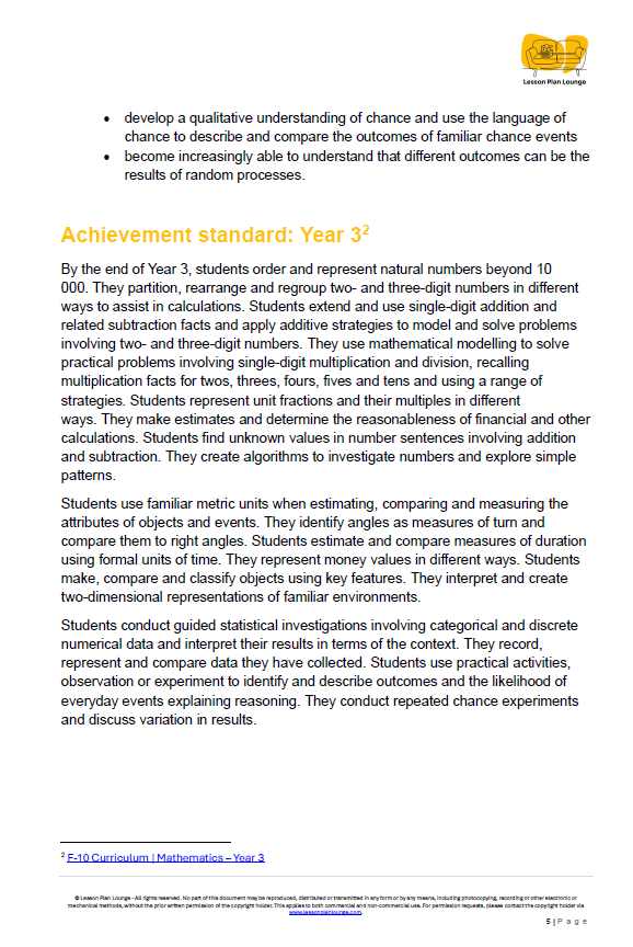 - Australian Curriculum Aligned: This unit is fully aligned with the Year 3 Mathematics curriculum (Version 9.0). It explicitly covers key content descriptors including AC9M3N02, AC9M3ST01, AC9M3ST03, AC9M3ST02, AC9M3P01 and AC9M3P02.